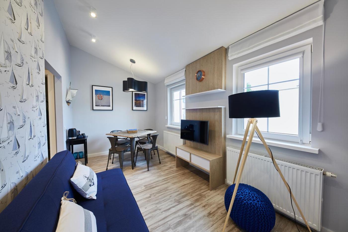 Apartament typu Deluxe. Featuring a private entrance, this apartment is comprised of 1 living room, 1 separate bedroom and 1 bathroom with a walk-in shower and a hairdryer. In the well-fitted kitchenette, guests will find a stovetop, a refrigerator, a dishwasher and kitchenware. The apartment offers a flat-screen TV, a washing machine, soundproof walls, a tea and coffee maker as well as garden views. The unit offers 2 beds. Apartament - 5 osobowy. Powierzchnia pokoju ok.: 42 mkw. ;