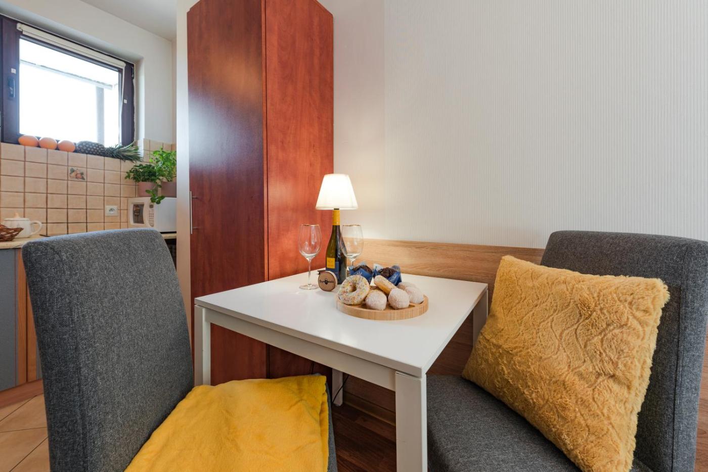 Apartament typu studio. This apartment comprises 1 living room, 1 separate bedroom and 1 bathroom with a shower and a hairdryer. Guests will find a stovetop, a refrigerator, kitchenware and a microwave in the kitchenette. The apartment also provides guests with a barbecue. The apartment provides a flat-screen TV, a seating area, a dining area, a wardrobe as well as garden views. The unit offers 2 beds. Apartament - 4 osobowy. Powierzchnia pokoju ok.: 30 mkw. ;