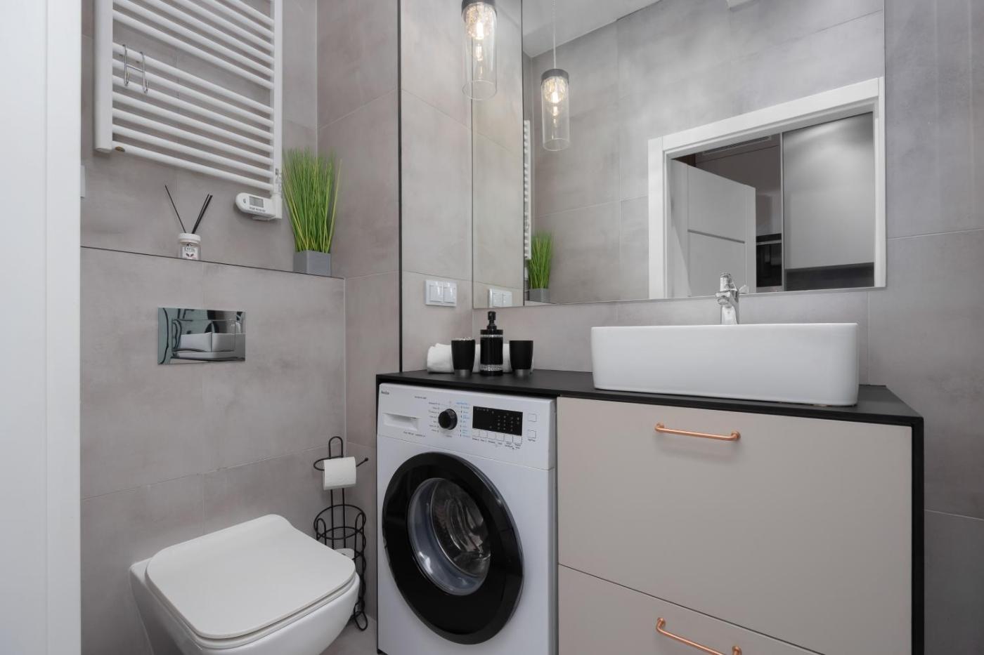 Apartament typu Studio z tarasem. Meals can be prepared in the well-fitted kitchenette, which has a stovetop, a refrigerator, kitchenware and an oven. The studio offers air conditioning, a washing machine, a terrace with ancourtyard view as well as a private bathroom boasting a shower. The unit has 1 bed. Studio - 2 osobowy. Powierzchnia pokoju ok.: 22 mkw.