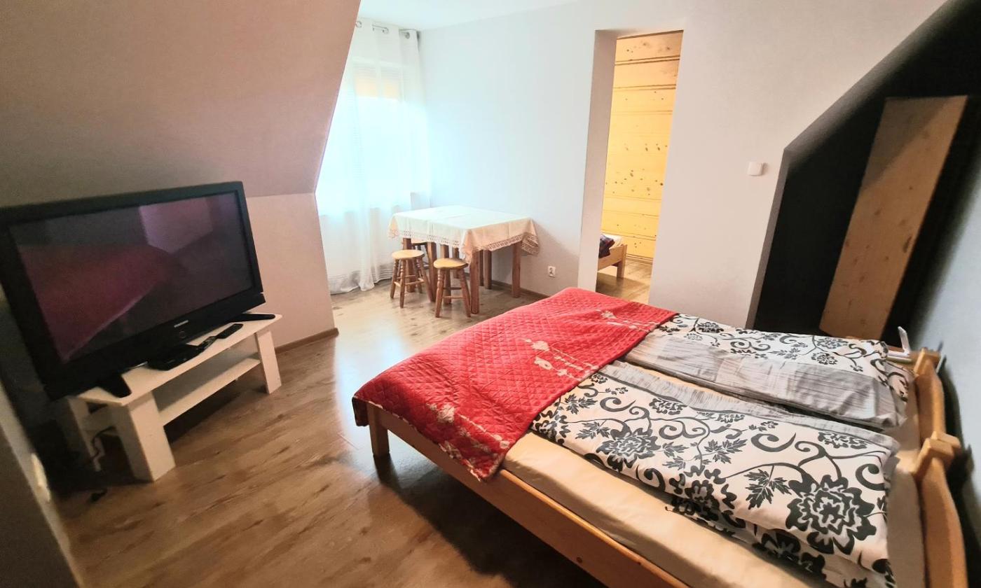 Pokój rodzinny. The family room features heating, as well as a private bathroom featuring a walk-in shower. The well-fitted kitchenette features a refrigerator, kitchenware and a microwave. The spacious family room provides a tea and coffee maker, a dining area, a wardrobe, a flat-screen TV, as well as garden views. The unit offers 5 beds. Rodzinny - 5 osobowy. Powierzchnia pokoju ok.: 42 mkw. ;